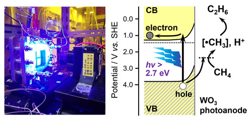 Herein, we report a continuous gas-fed photoelectrochemical (PEC) system with a proton exchange membrane for CH4 activation at ambient temperature and pressure. We found that both water splitting and steam reforming of CH4 were induced over oxide photoanodes. When the CH4 concentration was low, O2 and CO2 were formed on titanium oxide (TiO2) and tungsten trioxide (WO3) photoanodes under ultraviolet light irradiation. We also found that visible light enhanced CH4 activation and ethane (C2H6) formation over the WO3 photoanode. When the CH4 concentration increased, O2 formation was suppressed, with increasing production rates of CO2, C2H6, and CO. Under optimised conditions, the selectivity of C2H6 reached 57% on a carbon basis over the WO3 photoanode under visible-light irradiation. The production of C2H6 implies the formation of methyl radicals during the CH4 gas-fed PEC process. We also demonstrated the PEC coupling of ethane to n-butane and the visible-light-induced oxidation of CH4 without external bias.
