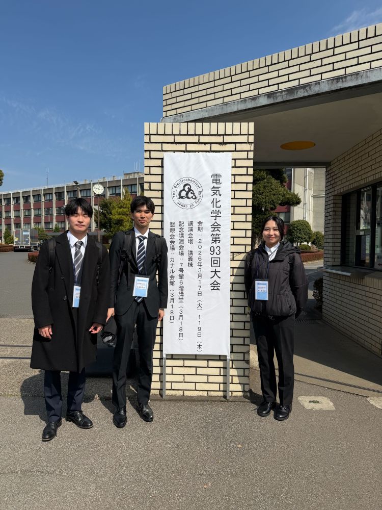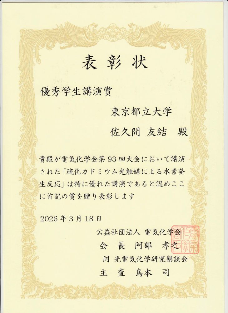電気化学会第93回大会(2026年3月17日~19日、東京理科大学)において、佐久間さんの発表が、優秀学生講演賞に選ばれました。おめでとうございます。Sakuma-san received the Student Presentation Award at the 93rd Annual Meeting of the Electrochemical Society of Japan (Mar. 17-19, 2026). Congratulations!