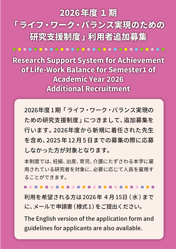 2026年度1期「ライフ・ワーク・バランス実現のための研究支援制度」につきまして、追加募集を行います。2026年度から新規に着任された先生を含め、2025年12月5日までの募集の際に応募しなかった方が対象となります。