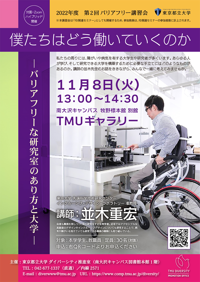 近年、社会では多くの障がいのある人が活躍をしており、本学でもこれまで数多くの障がいのある学生が教育研究に励んできました。また、国内外問わず、障がいのある大学院生や研究者は増加してきており、今後は今まで以上にアクセシブルな研究室や大学のあり方について考えていく必要があります。