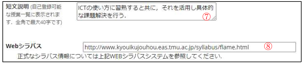 ⑧ Web シラバスシステムの当該授業ページのURL が入力してあります。受講生にWebシラバスを参照させる場合、以下の⑨、⑩、⑪は不要です。