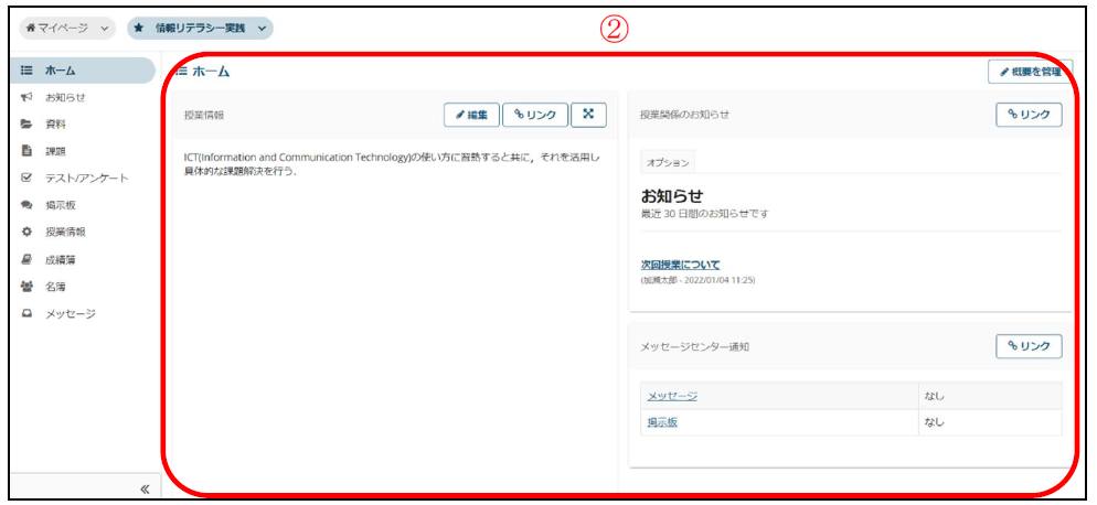 下図の赤枠内のようにマイページの時間割にも授業が表示されます。マイページの時間割には、参加している授業のうち表示対象の授業が表示されます。