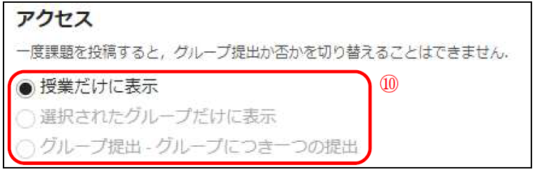 ⑩ 課題の対象者を決めます。グループが登録されていない場合は授業だけに表示しか選択することはできません。