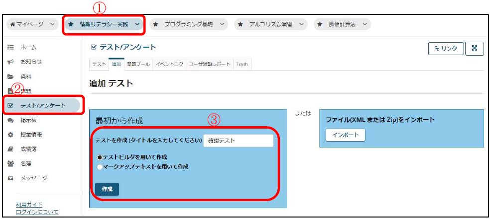 ③ テキストボックスに作成するテストのタイトルを入力し、「作成」ボタンを押します。