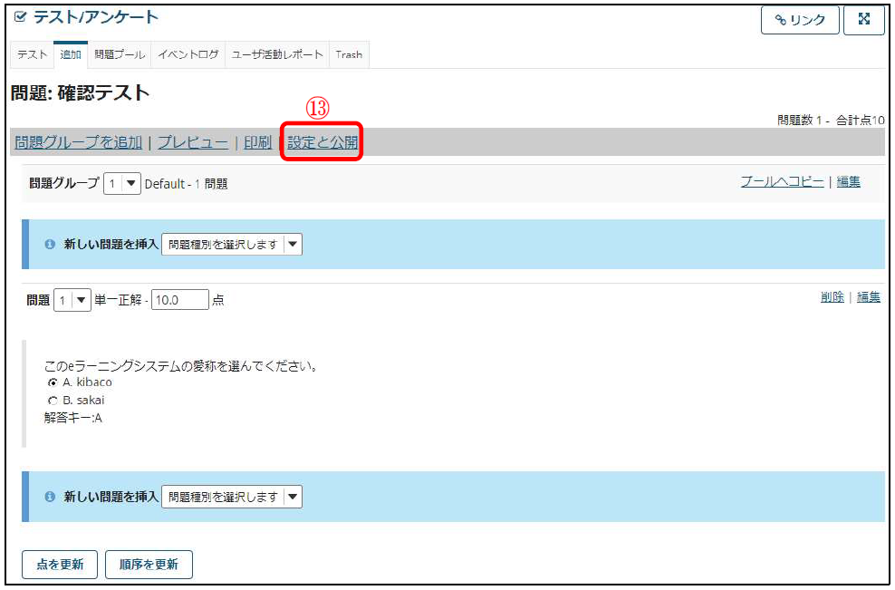⑭ 作成したテストの詳細設定画面へ移動します。