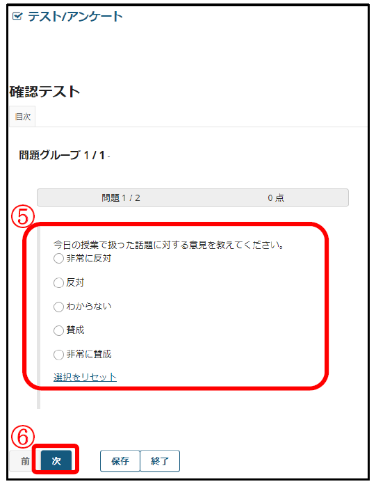 ⑥「次」ボタンを押し、 1 問ずつ回答していきます。