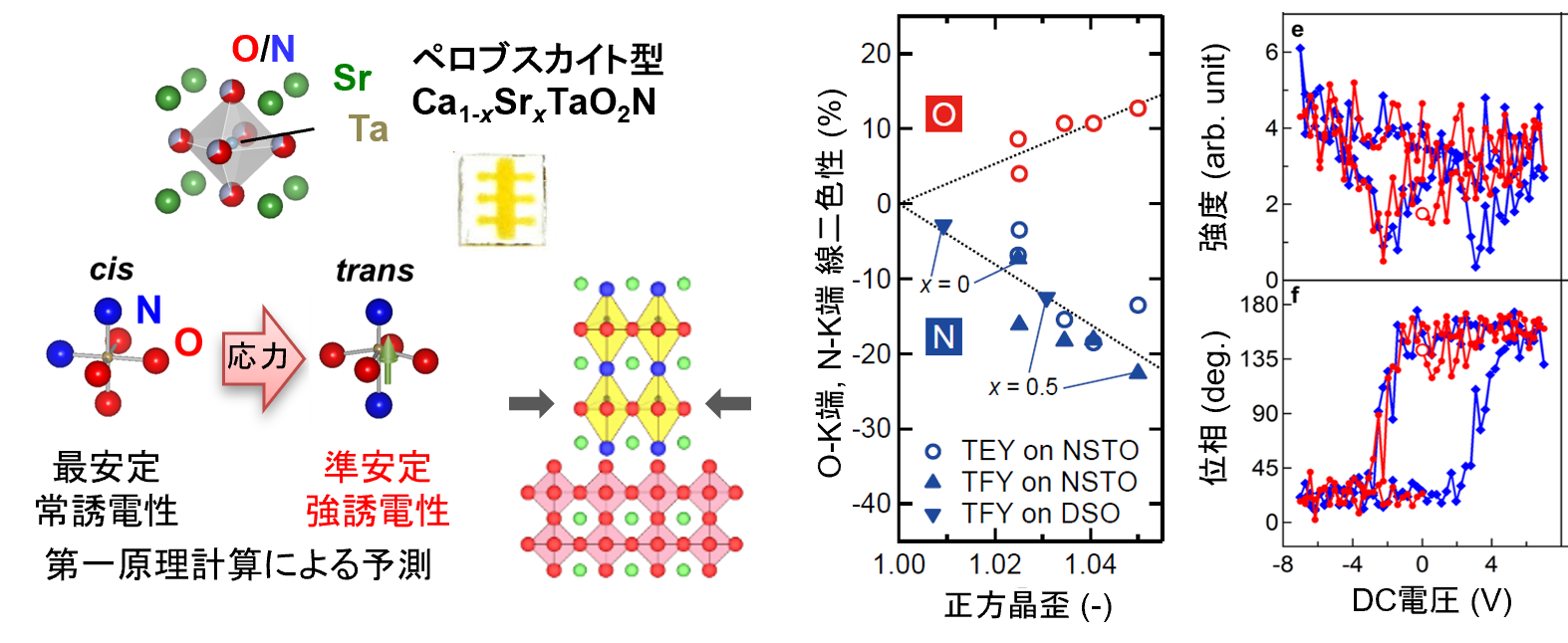 強誘電体に光を照射すると、中心対称性の破れにより自発分極の向きに応じた巨大な光起電力を示すことから、高効率な太陽電池や光触媒への応用が期待されています。しかし、室温以上のキュリー温度をもつ強誘電体の多くはワイドギャップの酸化物絶縁体で、可視光を吸収可能な材料はごく限られています。私たちは電気陰性度の低いNの2p軌道が価電子帯上端を形成してバンドギャップが縮小するペロブスカイト型酸窒化物半導体に注目し、SrTaO_{2}Nのエピタキシャル薄膜が強誘電性を示すことを初めて発見しました。さらに、第一原理計算とX線吸収分光や原子分解能電子顕微鏡分光により、基板からのエピタキシャル歪みによって生成した準安定なtrans型の窒素配列がSrTaO_{2}N薄膜の強誘電性の起源であることを示しました。これらの結果は、強誘電性半導体の新たな開発指針を示すと同時に、アニオン配列(cis/trans異性体)制御に基づく複合アニオン化合物の機能設計の道を拓くものです。