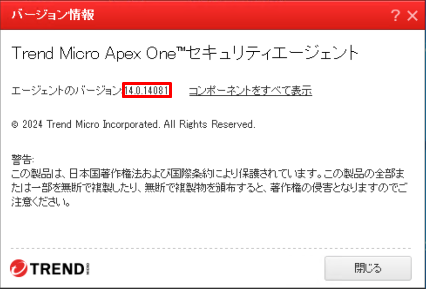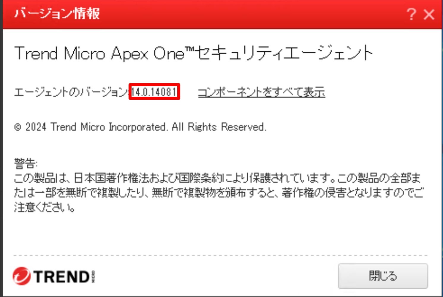 ③[エージェントのバージョン]が 14.0.14081 以降であれば最新バージョンに更新済みですので確認作業は終了です。