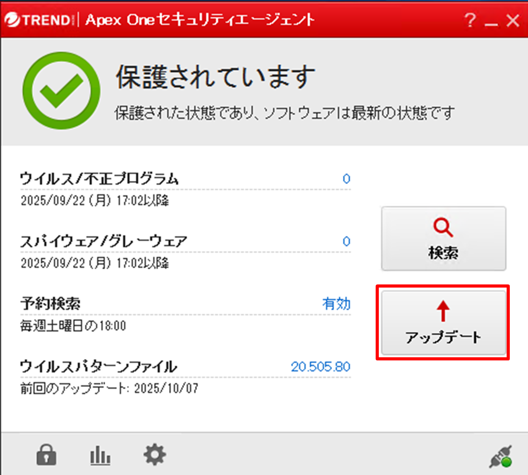[ApexOneセキュリティエージェント]画面から、手動でアップデートを行ってください。(下記画像参照)