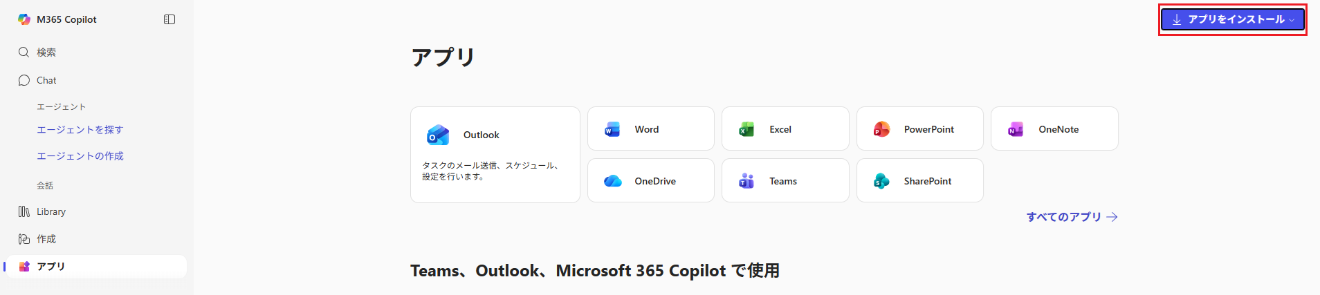 ①Microsoft365のログイン後、M365 Copilotが表示されるので画面から、「アプリ」をクリック