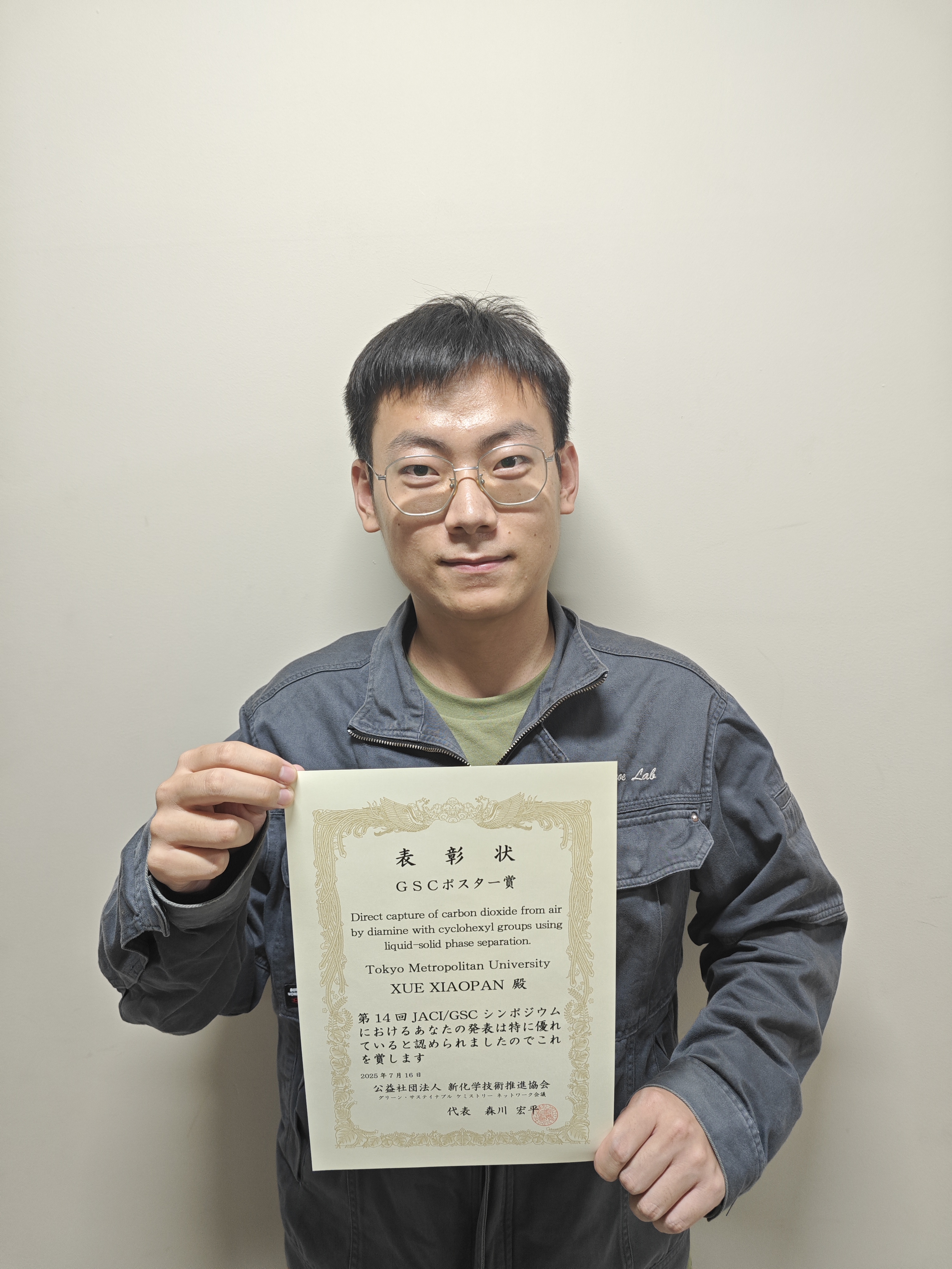 発表タイトルは「Direct capture of carbon dioxide from air by diamine with cyclohexyl groups using liquid-solid phase separation」です。